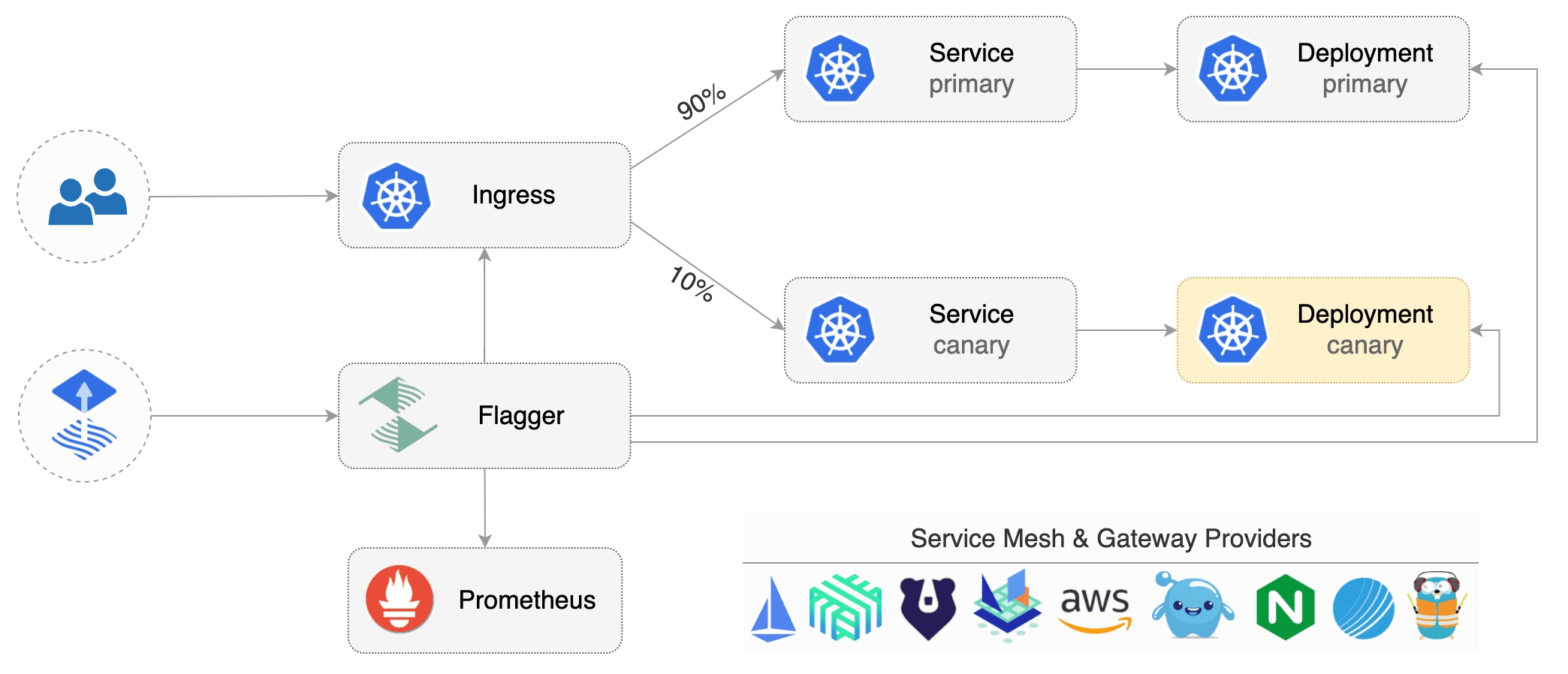 Flagger seamlessly integrates with modern cloud-native tools: