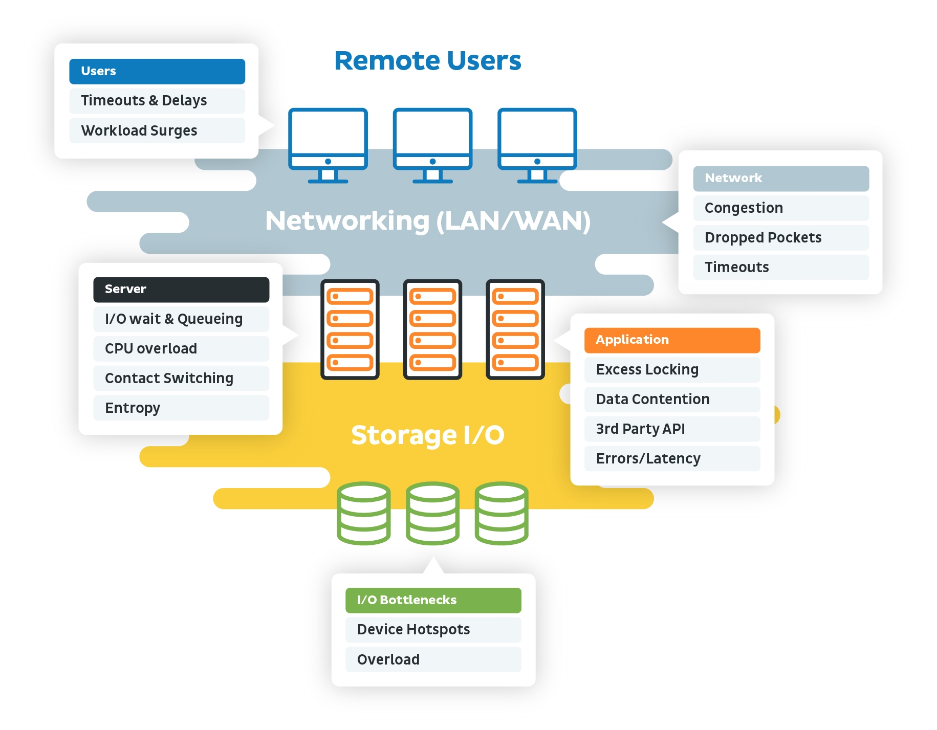 These four areas are inextricably linked, meaning that poor performance in one area will lead to poor performance in another area. Engineers concerned with understanding application performance, should focus on these four core areas.